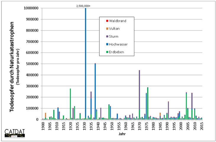 Mehr als acht Millionen Tote durch Erdbeben, Flut, Sturm, Vulkanausbruch und Buschfeuer seit 1900 sind in der Datenbank CATDAT verzeichnet (ohne die Toten durch Langzeitfolgen, Trockenheit und Hungersnot).