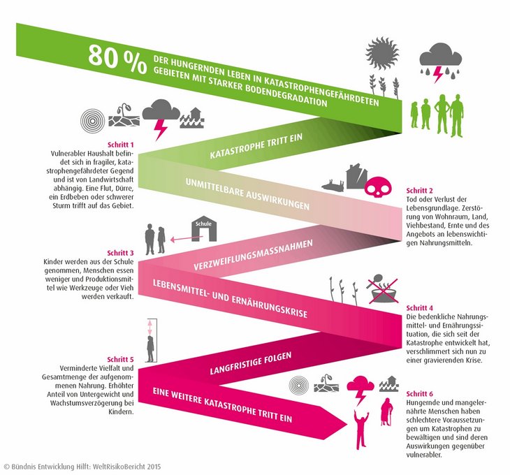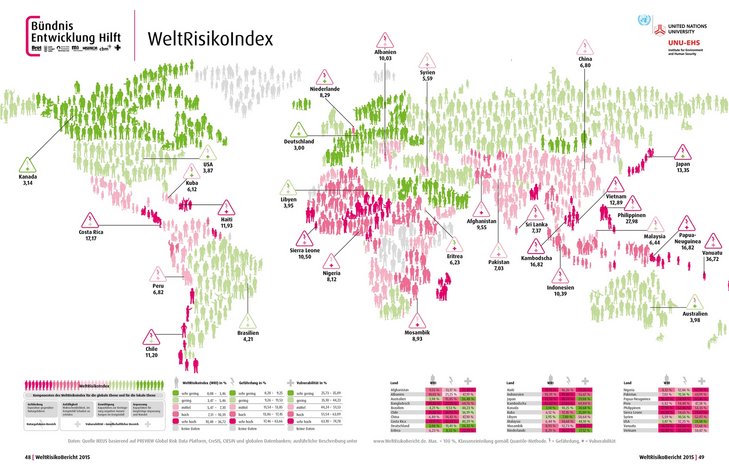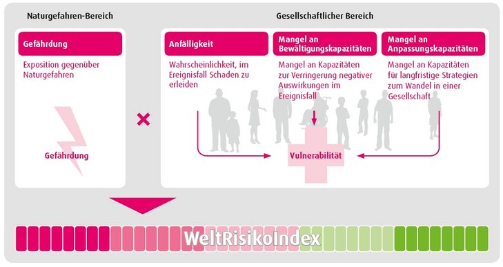 Wie hängt das Katastrophenrisiko eines Landes mit der gesellschaftlichen Situation zusammen? Welchen Einfluss haben Faktoren wie Regierungsführung, Qualität des öffentlichen Gesundheitssystems, Umweltsituation und Bildungsniveau auf die Gefährdung eines Landes durch Naturkatastrophen? Der aktuelle WeltRisikoBericht versucht, Antworten auf diese Fragen zu geben. Der Bericht enthält den, vom Institut für Umwelt und menschliche Sicherheit der Universität der Vereinten Nationen erstellten WeltRisikoIndex. Der Index gibt für 171 Länder weltweit das Risiko an, Opfer einer Katastrophe in Folge von extremen Naturereignissen zu werden.