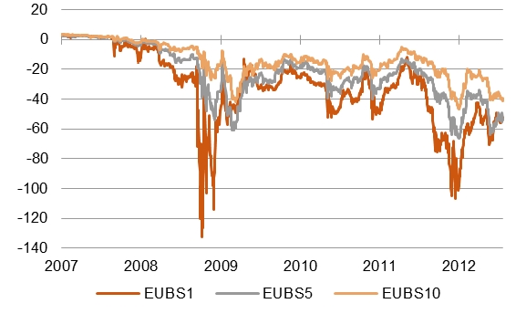 Vor Lehman lagen die Kosten eines Zins-Swaps zwischen US-Dollar und Euro nahe Null. Seit Lehman ist dieser unter hohen Schwankungen extrem negativ geworden, was mehrere Ursachen hat. Offensichtlich haben viele europäische Banken einen hohen Bedarf an USD-Funding und somit besteht eine starke Nachfrage nach US-Dollar aus Europa. Die Ende 2011 umgesetzte konzertierte USD-Swap-Faszilität hat etwas Entspannung gebracht, ohne den Trend grundsätzlich zu brechen. Ein vor dem Hintergrund des Libor-Skandals wieder erstarktes Argument ist außerdem, dass die Banken des europäischen Libor/Euribor-Panels im Schnitt eine schlechtere Kreditqualität aufweisen als das im US-Libor-Panel der Fall ist – auch das erklärt einen Teil des negativen Basis-Swaps.