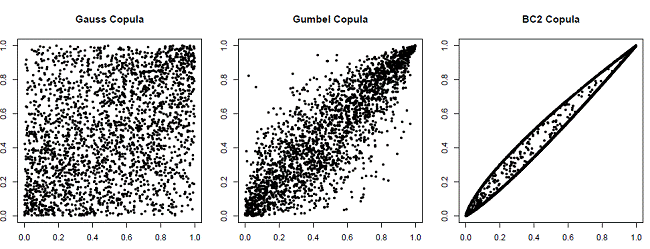 Abb. 01: Gauss Copula, Gumbel Copula und BC2 Copula