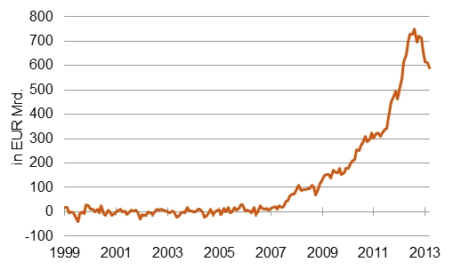 Gemessen an den Marktreaktionen ist aber manches entspannter geworden. Rom zahlt an den Kapitalmärkten so wenig Zinsen wie schon lange nicht mehr. Die Aktienkurse in Griechenland sind zuletzt um 12 Prozent gestiegen. Der Euro hat sich auf den Devisenmärkten befestigt. Die Kapitalflucht aus den Krisenländern hat sich beruhigt. Das zeigt sich unter anderem daran, dass sich die Forderungen der Bundesbank an das Eurosystem (die berüchtigten Target-Salden) verringern, seit September um 20 Prozent oder EUR 160 Mrd. (siehe Grafik).