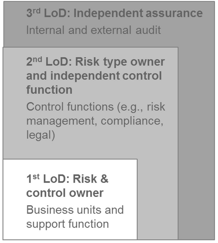 Um die eindeutige Zuweisung von Rollen und Verantwortlichkeiten strukturell sicherzustellen, hat sich in der Praxis, auch getrieben durch regulatorische Anforderungen, der Three-Lines-of-Defense- Ansatz entwickelt (siehe Abb. 02). Die erste Verteidigungslinie besteht aus den Geschäftseinheiten mit eigener Gewinn- und Verlustrechnung, die durch ihre Tätigkeit am Markt Risiken eingehen und steuern müssen. Die Risiko- und Kontrolleigner werden durch unabhängige Kontrollfunktionen in der zweiten Verteidigungslinie unterstützt. Diese Einheiten, beispielsweise Risikomanagement, Compliance, Controlling, definieren die Rahmenbedingungen für bestimmte ihnen zugewiesene Risikoklassen. So schreibt und kommuniziert beispielsweise Compliance eine AML-Richtlinie, die Prinzipien, Prozesse und Kontrollanforderungen für die Geschäftsprozesse in den Business Units definiert. Für die Umsetzung dieser (Mindest-)Anforderungen ist die 1st LoD verantwortlich, was durch die Kontrollfunktionen überwacht wird. Die tatsächliche Ausübung dieser Aufgaben und das Zusammenspiel der einzelnen Einheiten werden dann unabhängig durch die interne Revision (3rd LoD) überwacht.