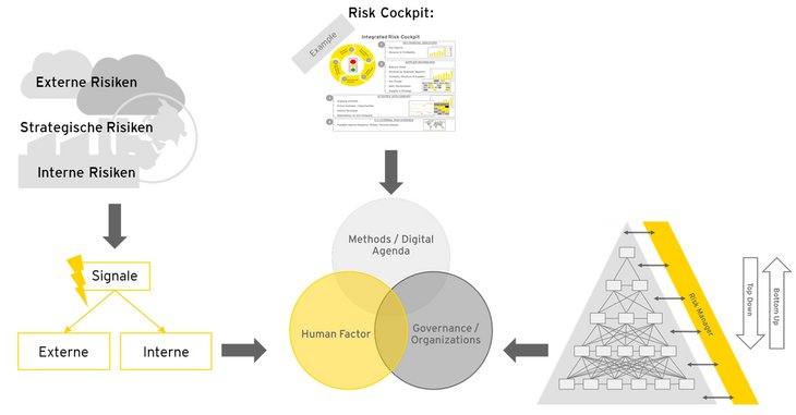 Wie können alle diese Ergebnisse nun in ein integriertes Risikomanagement zusammengefasst werden? Die unterschiedlichen Risikoarten werden über die Signale von den Mitarbeitern einer Organisation identifiziert. Diese unterschiedlichen Risiken werden dann durch die Governance, beziehungsweise Unternehmensorganisation, Top-Down oder Bottom-Up kommuniziert und letztlich im Reporting (beispielsweise Risikocockpit) des Unternehmens ganzheitlich dargestellt. In dieser Vorgehensweise sind alle Kernelemente eines gesamtheitlichen Risikomanagements berücksichtigt.