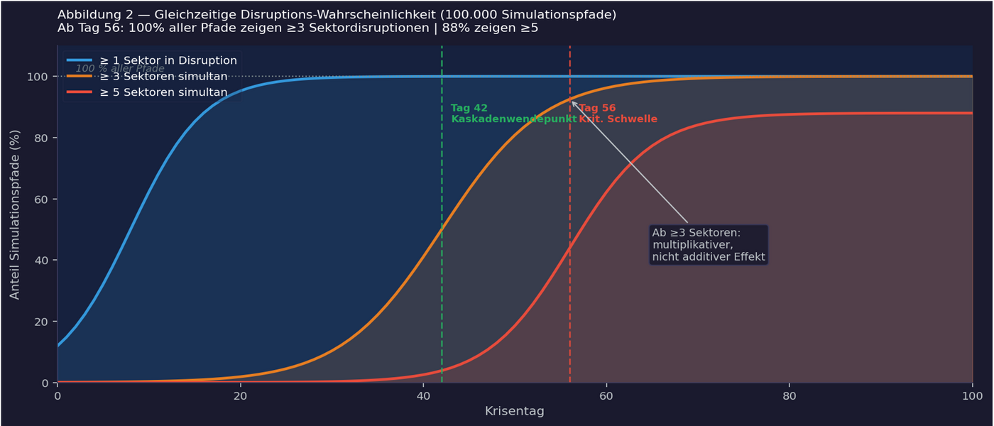 Abb. 02: Gleichzeitige Disruptions-Wahrscheinlichkeit über 100.000 Simulationspfade. Ab drei gleichzeitigen Sektordisruptionen verstärken sich Schocks multiplikativ, nicht additiv. Tag 42: Kaskadenwendepunkt. Ab Tag 56: 100 Prozent aller Pfade zeigen ≥3 Sektordisruptionen; 88 Prozent zeigen ≥5.