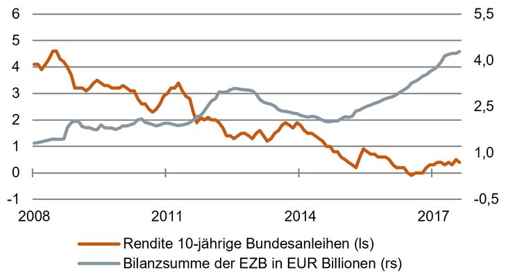 Wenn man es genau bedenkt, ist dies auch nicht wirklich überraschend. Denn mit der Verringerung der Wertpapierkäufe hört das "Quantitative Easing" (wie man die Wertpapierkäufe der Zentralbank nennt) nicht auf. Die Liquidität wird nicht zurückgeführt. Sie steigt nur nicht mehr so stark. Erst wenn die Zentralbank auch ihre Wertpapierbestände verringert, müssten restriktive Effekte eintreten. Damit hat die Federal Reserve aber erst vor ein paar Wochen (also drei Jahre nach dem offiziellen Ende der Wertpapierkäufe) begonnen. Bei der EZB ist davon überhaupt noch nicht die Rede. Wenn sie das gleiche Tempo vorlegt wie die Fed (was nicht unwahrscheinlich ist), dann ist damit erst im Jahr 2020 zu rechnen.