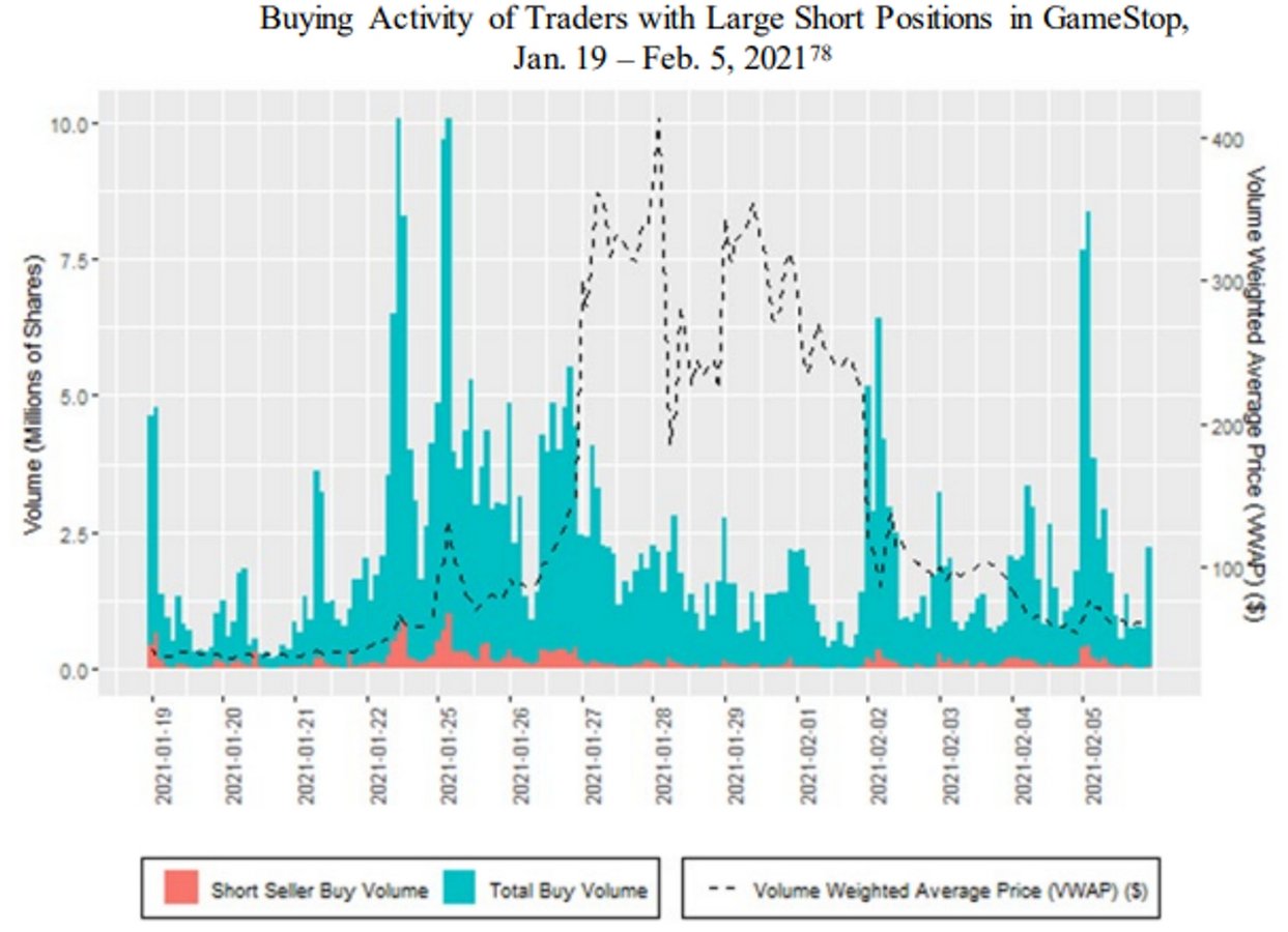 "The underlying motivation of such buy volume […] Whether driven by a desire to squeeze short sellers […] or by belief in the fundamentals of GameStop, it was the positive sentiment, not the buying-to-cover, that sustained the weeks-long price appreciation of GameStop stock." (S. 26)