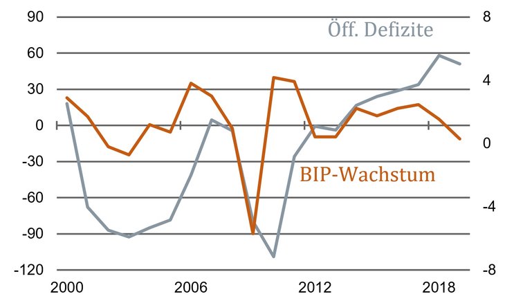 Zögerliche Finanzpolitik: Öffentlich Defizite in EUR Mrd. (ls), BIP-Wachstum in % (rs), Deutschland [Quelle: Ameco]