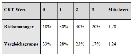 Es wird deutlich, dass die Risikomanager im Mittel einen höheren CRT-Wert erreicht haben, folglich eher das System 2 aktivierten als die Vergleichsgruppe aus Studierenden verschiedener Hochschulen. In allen Gruppen wird dieser Unterschied sichtbar bis auf die Gruppe derer, die eine Antwort korrekt gaben. Nur dort ist der Anteil der Vergleichsgruppe etwas höher, aber gerade bei 2 oder 3 korrekten Antworten werden die Unterschiede zwischen den Risikomanagern und Fredericks Vergleichsgruppe deutlich.