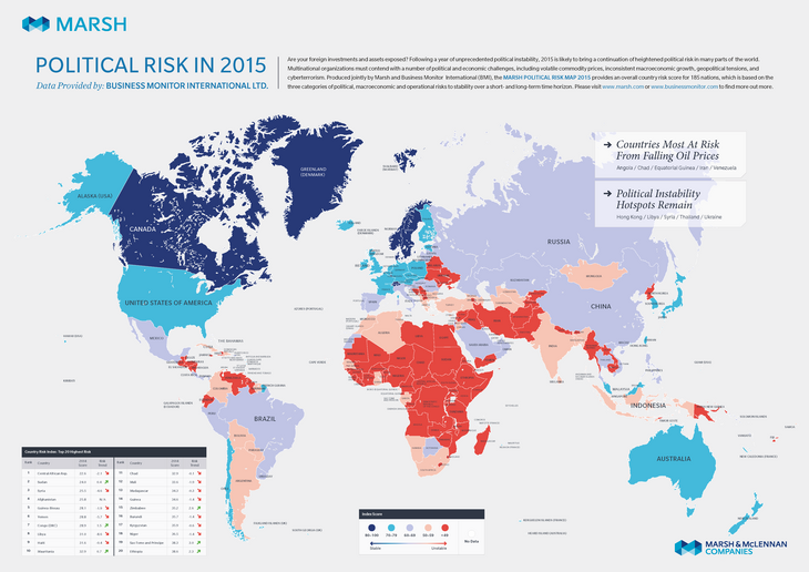 Die Political Risk Map 2015 und der zugehörige Bericht "Growing political risk in the year ahead and beyond" von Marsh, einem weltweit tätigen Industrieversicherungsmakler und Risikoberater, machen deutlich, wie die Zunahme der geopolitischen Spannungen, politisch motivierter Gewalt und innerstaatlicher Konflikte in Kombination mit sinkenden Rohstoffpreisen die politischen Risiken verschärft und welche Herausforderung dies für international agierende Unternehmen darstellt.
