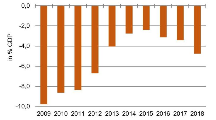 Jetzt scheint sich der Wind aber wieder zu drehen. In Italien wettert die neue Regierung gegen das finanzpolitische "Diktat" von Brüssel. Rom würde das öffentliche Defizit liebend gerne wieder über die Grenze von minus 3 Prozent erhöhen. Griechenland, kaum aus dem Anpassungsprogramm der Troika entlassen, hat angekündigt, dass es einige der geplanten Sparmaßnahmen rückgängig machen möchte. Die USA, die die Neuverschuldung nach der großen Finanzkrise ebenfalls deutlich reduziert hatten, sind dabei den Fehlbetrag ebenfalls drastisch zu erhöhen (Grafik). In diesem Jahr wird der Staatshaushalt durch Investitionsprogramme und die Steuerreform vermutlich um zusätzliche USD 300 Mrd. belastet. Unter Ökonomen ist ein theoretischer Streit entbrannt, ob die Sparmaßnahmen in Europa in den letzten Jahren vielleicht nicht doch etwas überzogen waren.