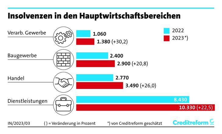 In allen Hauptwirtschaftsbereichen verzeichnete Creditreform einen deutlichen Anstieg der Insolvenzzahlen. Im Verarbeitenden Gewerbe stiegen die Fallzahlen am stärksten an (plus 30,2 Prozent) – es folgt der Handel (plus 26,0 Prozent). Im Baugewerbe war ein Anstieg um 20,8 Prozent zu verzeichnen. Der Zuwachs im Dienstleistungsgewerbe im Vergleich zum Vorjahr betrug plus 22,3 Prozent.