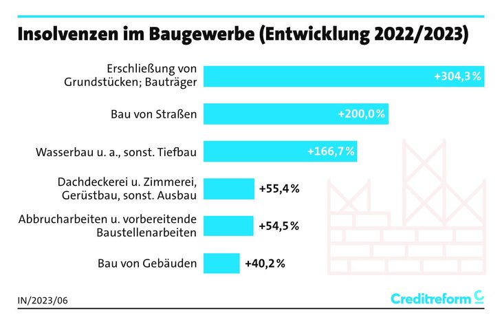 Creditreform Sprecher Hantzsch fasst zusammen: "Der Druck auf die Liquiditätslage der Bauunternehmen steigt unter den aktuellen Bedingungen immer mehr. Die Insolvenzzahlen im Sektor reagierten bereits. Besonders betroffen waren im Jahr 2023 Branchen wie beispielsweise Erschließung von Grundstücken und Bauträger, Straßenbau und Tiefbau. Weiter zunehmende Belastungen für das Baugewerbe dürften diesen Trend noch verstärken."