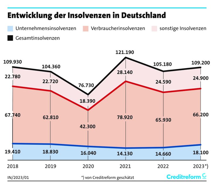 Insgesamt wurden in Deutschland im Jahr 2023 109.200 Insolvenzverfahren gezählt. Das ist ein Anstieg um 3,8 Prozent gegenüber dem Vorjahr (2022: 105.180).