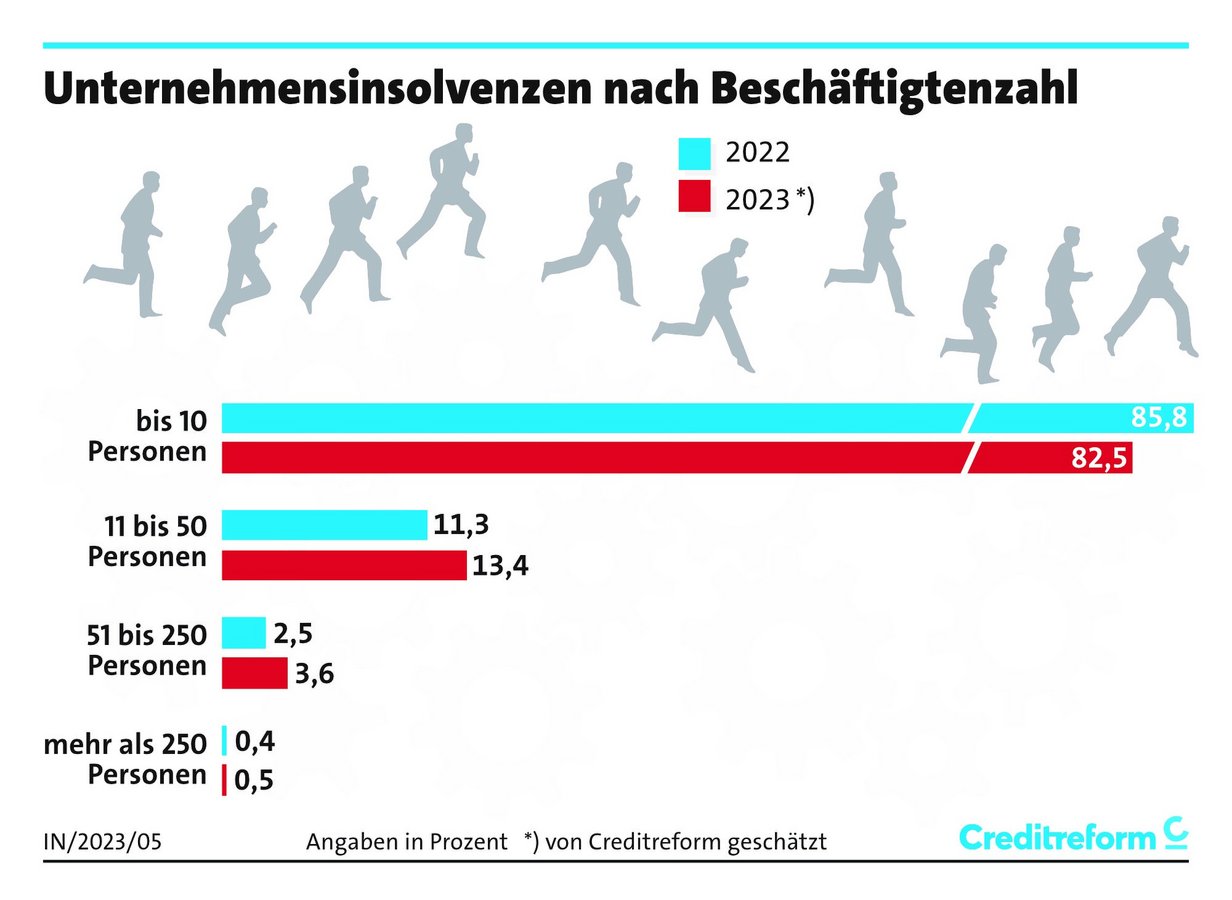 Die Untersuchung der Creditreform Wirtschaftsforschung belegt eine massiv gestiegene Zahl an Insolvenzen von mittleren und großen Unternehmen. Bei Großunternehmen mit mehr als 250 Mitarbeitern lagen die Fallzahlen um 50 Prozent über dem Vorjahreswert. Zahlreiche prominente Insolvenzen gab es 2023 im Handel (u. a. Peek & Cloppenburg sowie Real GmbH). Bei Unternehmen mittlerer Größe mit 51 bis 250 Beschäftigten stiegen die Insolvenzen sogar um rund 76 Prozent, bei kleinen Unternehmen mit bis zu 10 Beschäftigten um knapp 19 Prozent. 2023 waren zudem mehr Arbeitnehmer von der Insolvenz betroffen. Schätzungsweise 205.000 Arbeitsplätze sind bedroht bzw. weggefallen (2022: 175.000).