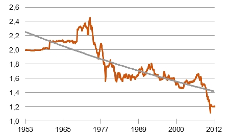 Die Aufwertung des Schweizer Franken (EUR/CHF-Kurs) [Quelle: Bundesbank, Kurse vor 1999 aus den D-Mark Kursen errechnet]
