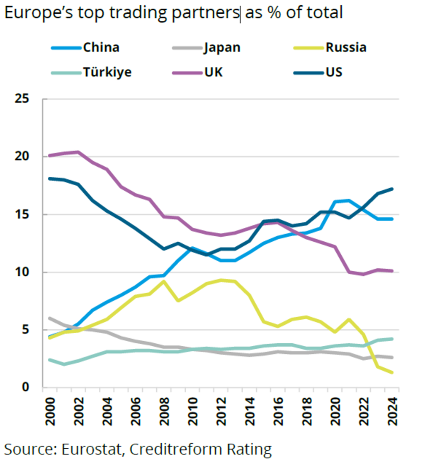 - Moderates Wachstum im Euroraum: Für das Jahr 2025 erwarten die Analysten von Creditreform Rating ein reales BIP-Wachstum von 0,9 Prozent im Euroraum. Geopolitische Unsicherheiten, Handelskonflikte und schwache Auslandsmärkte belasten die Konjunktur, während Reallohnzuwächse und ein robuster Arbeitsmarkt den privaten Konsum stützen. 2026 dürfte sich das Wachstum auf 1,2 Prozent beschleunigen.