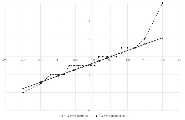 Abb. 02: In dem Q-Q-Plot sind die Quantile der beobachteten Verteilung der Tordifferenz aller Länderspiele zwischen Deutschland und Brasilien (positive Werte bedeuten einen Sieg für Deutschland) den Quantilen der Normalverteilung gegenüber gestellt. Bis auf den Sieg mit sechs Toren Differenz im WM Halbfinale 2014 sieht man, dass die die empirischen Werte nahezu normal verteilt sind.