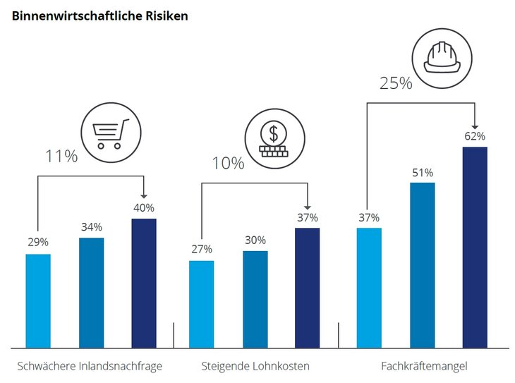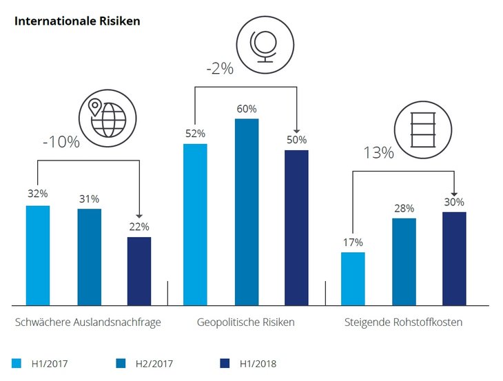 Einen bemerkenswerten Wandel gibt es bei den Risikofaktoren, die CFOs für ihr eigenes Unternehmen sehen. Seit der Krimkrise 2014 dominierten politische, internationale Risiken die Agenda der CFOs. Dies ist im Frühjahr 2018 nicht mehr der Fall. Politische Risiken werden zwar nach wie vor als sehr bedrohlich eingeschätzt, aber der Fachkräftemangel stellt aktuell ein größeres Problem für die Unternehmen dar. Fast zwei Drittel der CFOs bewerten ihn als hohes Risiko für ihr Unternehmen in den kommenden zwölf Monaten.