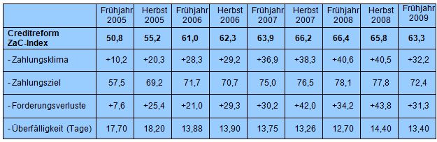 Der schärfste Konjunktureinbruch in der Geschichte der Bundesrepublik zeigt erste Auswirkungen auf das Zahlungsverhalten. Rechnungen werden schleppender bezahlt, Leistungserbringer bleiben häufiger als in der Vergangenheit auf offenen Forderungen sitzen. Dabei haben Wirtschafts- und Finanzkrise das Zahlungsverhalten der privaten und gewerblichen Auftraggeber deutlich stärker beeinträchtigt als das der öffentlichen Hand. Ein dramatischer Einbruch der Zahlungsmoral blieb bislang aber aus. Der Creditreform ZaC-Index (ZaCX), der das Zahlungsverhalten in Deutschland anhand regelmäßiger Unternehmensbefragungen und dem Zahlungserfahrungspool von Creditreform in einem Indikator zusammenfasst, sinkt gegenüber dem Vorjahr um drei Zähler und notiert bei 63,3 von 100 möglichen Punkten.