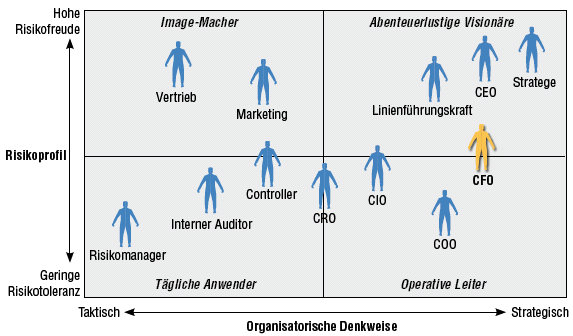 Der Umgang mit Risiken ist je nach Rolle in der Organisation unterschiedlich. Ein in der Studie zitierter Finanzvorstand beobachtete: "An der Spitze der Organisation ist die Risikofreude stark ausgeprägt, doch mit jeder Hierarchieebene nach ‚unten‘ nimmt die Risikoabneigung zu." Das Risikomanagement wird oft in stärkerem Maße von der Unternehmenskultur (zum Beispiel konservativ oder aggressiv) als von Fakten bestimmt. Ein anderer Finanzvorstand eines australischen Elektrizitätswerkes erklärte: "Alle Geschäftseinheiten steuern ihre Risiken auf der Grundlage des vom Finanzbereich entwickelten Risikossystems oder -profils des Unternehmens." Daher können Finanzvorstände die Vorstandsebene dabei unterstützen, die Risikofreude und -toleranz des Unternehmens im Gleichgewicht zu halten, um ein besseres Verständnis für das ganzheitliche Risikoprofil des Unternehmens zu erreichen (siehe Abbildung).