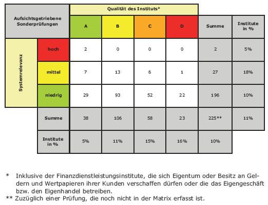 In der Risikomatrix lässt sich auch der risikoorientierte Prüfungsansatz der BaFin ablesen. Die Prüfungsquote steigt mit abnehmender Qualität der Institute an. Ein deutlicher Prüfungsschwerpunkt liegt bei den mit C und D bewerteten Instituten. Aber auch bei den Instituten, die in die Kategorie A einzuordnen sind, kann die Aufsicht nicht vollständig auf Prüfungen verzichten. In angemessenen Zeitintervallen muss sie sich hier einen vertieften Einblick in die tatsächliche Risikolage der Institute verschaffen.