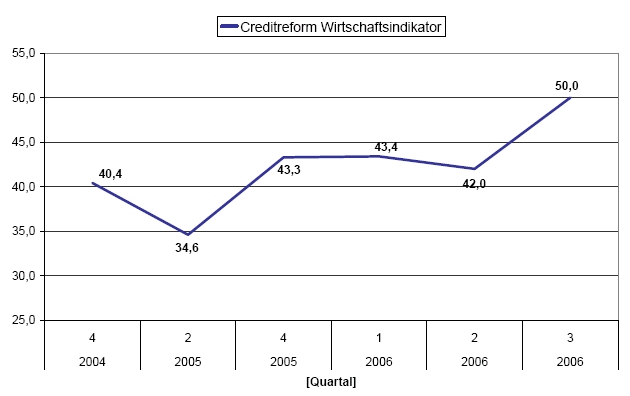 Der aktuelle Creditreform Wirtschaftsindikator steigt gegenüber der letzten Erhebung vom Mai 2006 um acht Punkte auf 50,0. Damit erreicht der Indikator seine bisher höchste Punktzahl. Dieser Aufschwung wird vor allem von einem stark verbesserten Geschäftsklima getragen. Der Indikator verarbeitet sowohl empirisch gewonnene Konjunkturdaten als auch aktuelle Wirtschaftsinformationen aus den Creditreform-Datenbanken. Dabei wird eine Indexzahl für die Gesamtwirtschaft errechnet und die Geschäftssituation von zehn Wirtschaftsbereichen bewertet.