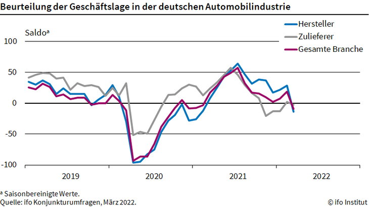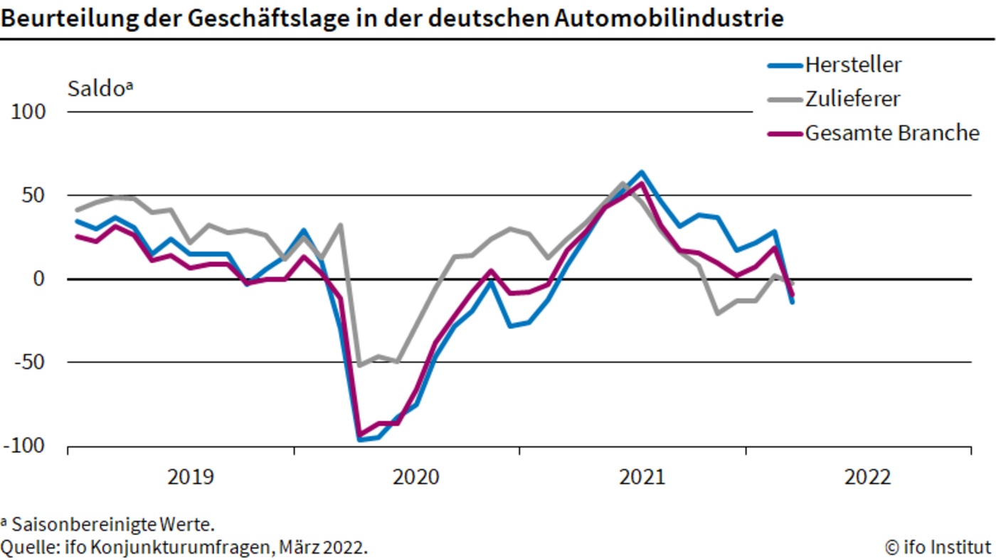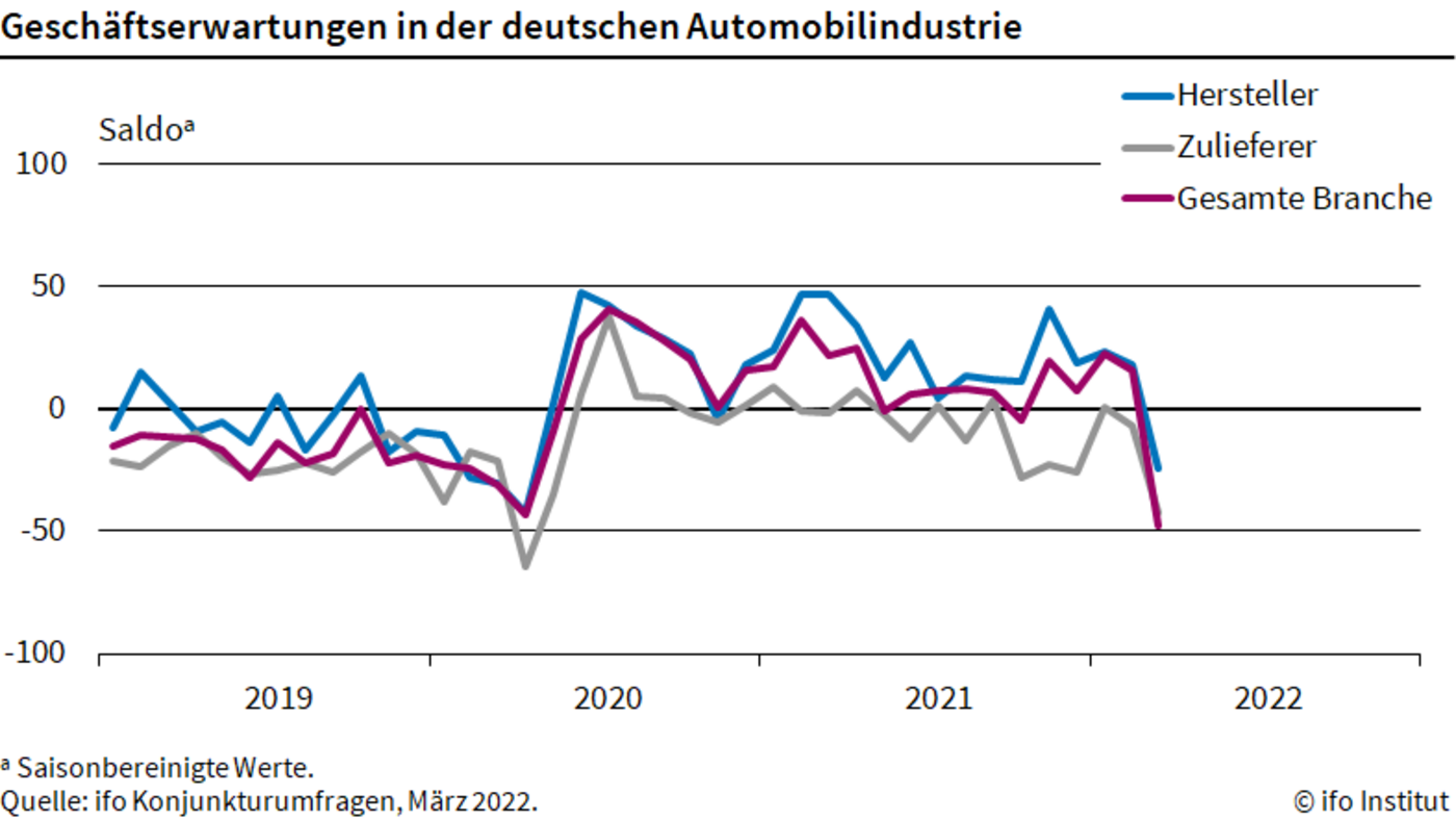 "Die Zulieferer werden die Rohstoffkrise auf breiter Linie spüren", sagt Falck. Die Erwartungen fielen auf minus 37,9 Punkte, nach minus 6,2 im Februar. Die Auftragsbücher sind dünn, und die Nachfrage fiel im März wieder, von 9,8 auf minus 7,5 Punkte. Die Produktionserwartungen wurden zurückgenommen, von minus 0,7 Punkte auf minus 28,1 im März. Es sollen in den nächsten Monaten keine neuen Stellen geschaffen werden.