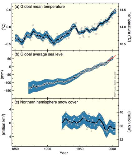 - Die Erwärmung des Klimasystems ist "ohne jeden Zweifel vorhanden". Die globale Oberflächentemperatur ist um 0,74 Grad gestiegen; elf der letzten zwölf Jahre waren die wärmsten seit Beginn der Aufzeichnungen.
