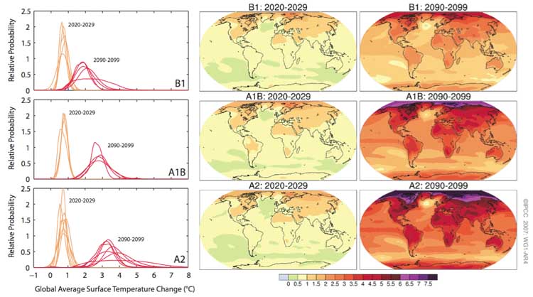 Abb 2: Drei Was-wäre-wenn-Szenarien haben die Forscher hier gegenübergestellt. Die Globen zeigen die erwarteten regionalen Klimaveränderungen (Mittelspalte 2020 bis 2029, Rechte Spalte 2090 bis 2099). Die Skala zeigt den Farbcode für die Temperaturveränderung in Schritten von einem halben Grad Celsius. Im Szenario B1 wird die Nutzung klimaschonender Technologien betont. Szenario A1B steht hingegen für weiter starken CO2-Ausstoß. A2 steht für eine langfristig besonders erwärmungsträchtige Entwicklung [Quelle: IPCC]