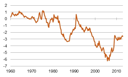 Schließlich geht das US-Leistungsbilanzdefizit zurück, das bisher immer ein Ärgernis nicht nur für die Vereinigten Staaten, sondern für die Weltwirtschaft insgesamt war. Es beträgt zwar immer noch 2,5 Prozent des BIP (siehe Grafik). Der Trend am aktuellen Rand geht aber hin zu einer weiteren Verringerung. Die USA werden in diesem Jahr mehr Öl fördern als sie importieren.![Verbesserung der US-Leistungsbilanz: US-Leistungsbilanz in % des BIP [Quelle: Fed] Verbesserung der US-Leistungsbilanz: US-Leistungsbilanz in % des BIP [Quelle: Fed]](/fileadmin/template_risknet/images_content/Abb-01-Huefner-2013-09-13.jpg)