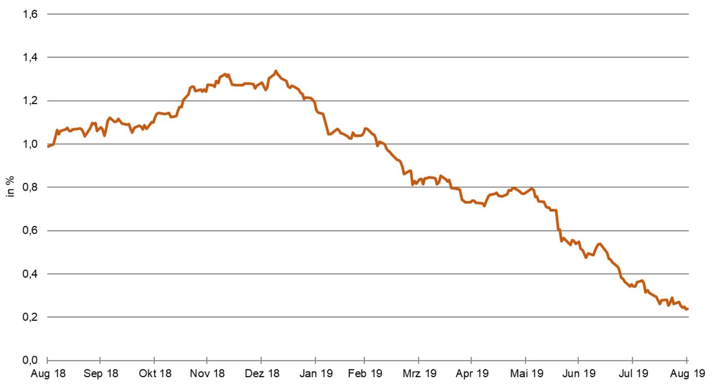 Wer also das Zinsrisiko jetzt nicht kostenfrei absichert, drückt damit implizit eine klare Erwartung weiter sinkender Zinsen aus – und nimmt dafür das Risiko von Kursverlusten aufgrund einer Gegenbewegung bei den Renditen in Kauf, obwohl die Absicherung dagegen den laufenden Ertrag nicht schmälert. Möglich wurde dies erst durch den Zinsrutsch in diesem Jahr. Der daraus entstandene Bedarf an Anleihen mit höherem Renditeaufschlag, also höherrentierliche Netflix statt renditearme Deutsche Telekom, wird möglicherweise die Risikoprämien noch weiter abschmelzen lassen.