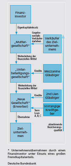 Leveraged Buyouts (LBOs) im Private-Equity-Markt. Die Experten der EZB schreiben in dem Artikel „Leveraged Buyouts and Financial Stability“, dass die Ausweitung der kreditfinanzierten Unternehmensübernahmen für die Finanzmärkte ein ähnlich hohes Risiko darstellen wie die aktuelle Krise am US-amerikanischen Hypothekenmarkt. Typisch für einen LBO ist, dass in der Regel die Kapitalbeschaffung durch Aufnahme von Bankkrediten bzw. durch die Emission von Anleihen erfolgt. Die Finanzierung der Zins- und Tilgungszahlungen erfolgt aus dem zukünftigen Ertrag des übernommenen Unternehmens oder auch häufig durch den Verkauf von Unternehmensanteilen. Die Erwartung des Erwerbers im LBO basiert auf dem Leverage-Effekt. Durch den geringen Einsatz von Eigenmitteln lässt sich eine hohe – für den Investor attraktive – Eigenkapitalrentabilität erzielen, solange die Gesamtkapitalrentabilität höher ist als der Fremdkapitalzins. Voraussetzung ist, dass das Zielunternehmen einen hohen freien Cash Flow erwirtschaftet, mit dem die Verbindlichkeiten getilgt werden. Während auf der einen Seite die Eigenkapitalgeber des LBO-Fonds Renditechancen erzielen, müssen diese jedoch – auf der anderen Seite – bei einem Scheitern der Transaktion auch mit einem Totalverlust des eingesetzten Kapitals rechnen. Die typische Struktur eines Leveraged Buyouts ist in Abbildung 1 (siehe rechts) skizziert.