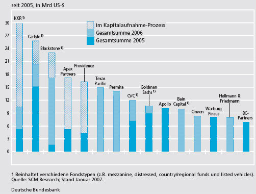 Gründe für die Volumenzunahme sind in der günstigen wirtschaftlichen Entwicklung, der niedrigen Inflation und dem starken Wettbewerbsdruck auf Seiten der Finanzintermediäre zu sehen. Diese haben zu sinkenden Renditeaufschlägen an den Finanzmärkten geführt und die Risikoneigung der Investoren deutlich erhöht. Die Private-Equity-Gesellschaften konnten für die von ihnen aufgelegten Fonds hohe Mittelzuflüsse verzeichnen und so die Grundlage für das rasante Marktwachstum legen (Bundesbank 2007). In der Spitze ist es einigen angelsächsischen Private-Equity-Gesellschaften seit 2005 gelungen, Eigenmittel in der Größenordnung deutlich zweistelliger Milliarden-US-Dollar-Beträge einzusammeln (siehe Abbildung 3).