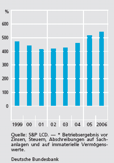 Der Risikogehalt einer LBO-Transaktionen nimmt in dem Maße zu, wie Fremdkapital zur Steigerung der Eigenkapitalrenditen eingesetzt wird, d.h. je stärker der Leverage-Effekt ausgenutzt wird. So haben seit dem Jahr 2001 die Leverage Multiples kontinuierlich zugenommen (siehe Abbildung 4). Kurzum: Den Zielunternehmen wird eine im Verhältnis zu ihrer anhand des EBITDA gemessenen Rückzahlungsfähigkeit eine immer höhere Schuldenlast aufgeladen.