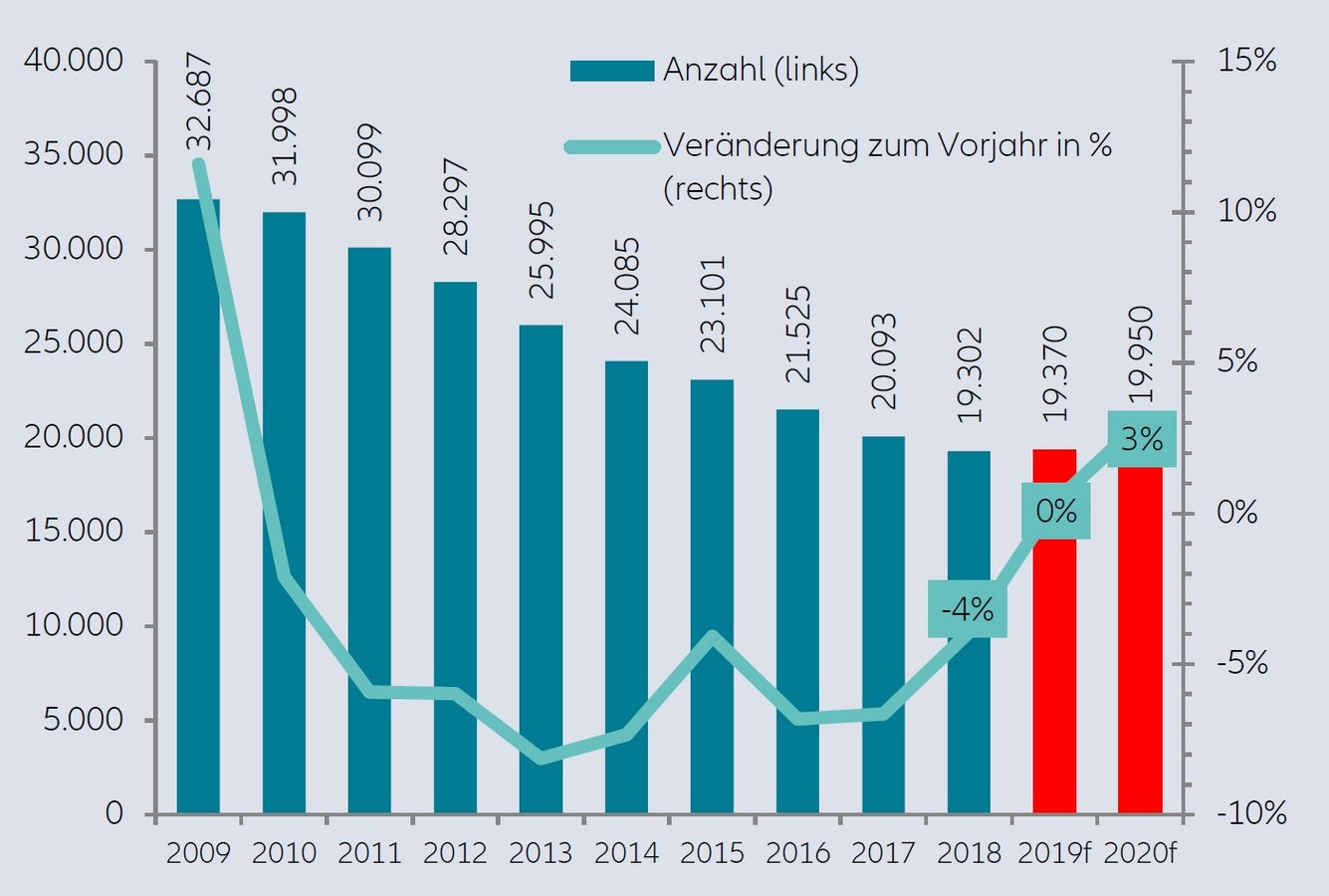 Große Insolvenzen häufen sich und der deutsche Wirtschaftsmotor stottert zuletzt ebenfalls. Trotzdem dürften die Insolvenzen in Deutschland im laufenden Jahr relativ stabil bleiben. Die Bundesrepublik verzeichnete in den ersten acht Monaten 2019 sogar erneut einen leichten Rückgang bei den Insolvenzen. Der weltweit führende Kreditversicherer Euler Hermes erwartet allerdings in den letzten vier Monaten des Jahres einen Anstieg bei den Pleitefällen, so dass die Zahlen am Jahresende auf vergleichbarem Niveau liegen dürften wie im Vorjahr. Dieser Anstieg zum Jahresende dürfte sich nach Ansicht der Euler-Hermes-Experten 2020 weiter fortsetzen. Der Kreditversicherer erwartet im kommenden Jahr 3 Prozent mehr Pleiten als 2019.