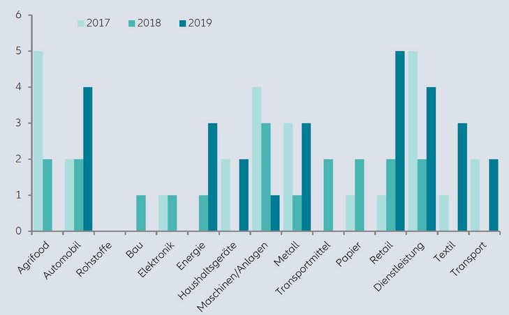 "Besonders viele große Insolvenzen gab es im bisherigen Jahresverlauf im Handel sowie in der Automobilindustrie, dem Dienstleistungssektor sowie Metall-, Textil- und Energiebranche", sagt Van het Hof. "Vorsicht ist gerade auch bei großen Namen geboten – sie schützen im Zweifelsfall nicht vor der Pleite. Einige sehr namhafte Unternehmen sind 2019 sogar bereits zum zweiten Mal in die Insolvenz gerutscht – ein Trend, der dies unterstreicht."