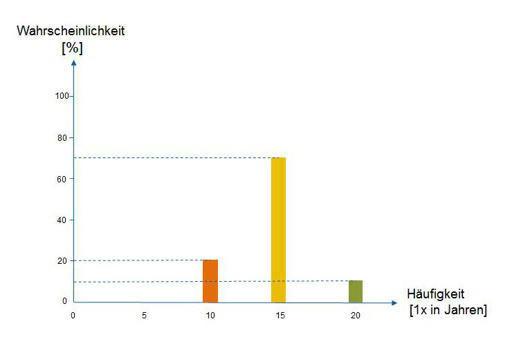 Sind es jedoch unvorhersehbare bzw. nicht planbare Ereignisse (Risiken oder Chancen), so sind sie sowohl in ihrer Auswirkung (vgl. Abbildung 1 oder Abbildung 2), als auch deren Häufigkeit zu beschreiben. Häufigkeiten unterliegen ebenfalls einer Unsicherheit und werden in analoger Form zur Auswirkung beschrieben. Das Beispiel in Abbildung 3 beschreibt ein Ereignis, dessen Eintreten mit einer Wahrscheinlichkeit von 20 Prozent einmal in 10 Jahren, zu 70 Prozent einmal in 15 Jahren und 10 Prozent einmal in 20 Jahren zu erwarteten ist.