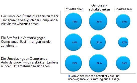 Hauptsächlich Privat- und Genossenschaftsbanken erwarten eine deutliche Zunahme der Bedeutung von Compliance – Sparkassen sehen sich weniger betroffen. Die Sektoren rechnen mit zunehmendem Druck der Öffentlichkeit hinsichtlich der Geschäfts- und Produkttransparenz; wachsende strafrechtliche Konsequenzen aus Compliance-Verstößen spielen ebenfalls eine wichtige Rolle.