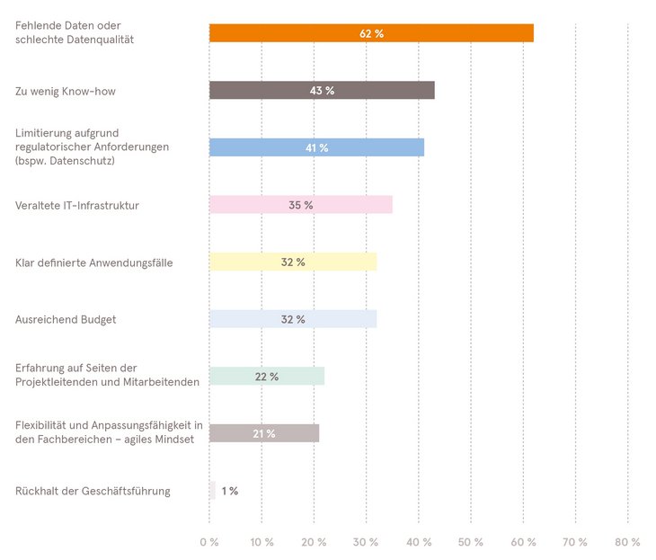 Abb. 01: Hürden bei der Umsetzung von KI in der Praxis [Mehrfachantworten möglich | nur teilnehmende Unternehmen, die bereits mit KI arbeiten]