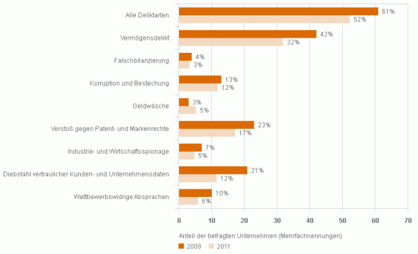 Laut einer Studie der Wirtschaftsprüfungs- und Beratungsgesellschaft PwC und der Martin-Luther-Universität Halle-Wittenberg verursachen wirtschaftskriminelle Handlungen in deutschen Unternehmen einen durchschnittlichen Schaden von rund 8,4 Mio. Euro. Im Jahr 2009 hatte die der entsprechende Vergleichswert noch 5, 6 Mio. Euro betragen. Insgesamt meldete gut die Hälfte der rund 830 befragten Unternehmen, in den vergangenen zwei Jahren mindestens einmal Opfer von Unterschlagung, Korruption, Industriespionage oder anderen Wirtschaftsdelikten geworden zu sein. In der vorangegangen Studie aus dem Jahr 2009 traf dies noch auf 61 Prozent der Befragten zu. 32 Prozent der Unternehmen berichten dabei über mindestens einen Fall von Betrug, Unterschlagung oder ähnlichen Delikten. Bei der Befragung im Jahr 2009 lag der Wert noch bei 42 Prozent. Auch der Diebstahl vertraulicher Kunden- oder Unternehmensdaten wird im Jahr 2011 mit 12 Prozent deutlich seltener genannt. Zwei Jahre zuvor hatten noch 21 Prozent der Befragten einen derartigen Fall zu vermelden.