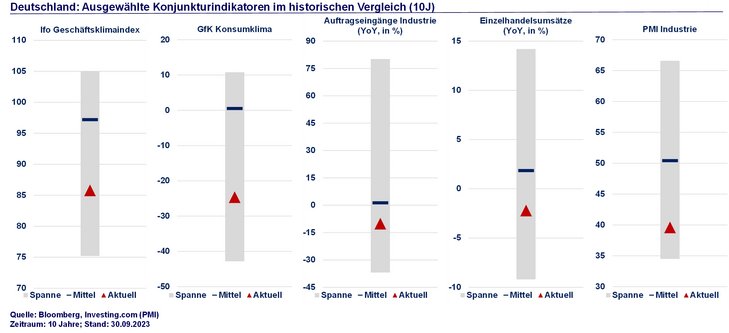 Sämtliche europäische Frühindikatoren deuten derzeit auf eine weitere, beschleunigte Abschwächung der bereits stark angeschlagenen Wirtschaftsleistung hin. Gerade in Deutschland hat der Einbruch dabei zunehmend strukturellen Charakter. In Folge der zahlreichen (in vergangenen Marktkommentaren häufig diskutierten) Fehlsteuerungen der letzten 20 Jahre ist Deutschland nun nicht nur wieder der "kranke Mann Europas", sondern, wie CDU-Generalsekretär Carsten Linnemann korrekt diagnostizierte, "der kranke Mann der Welt".