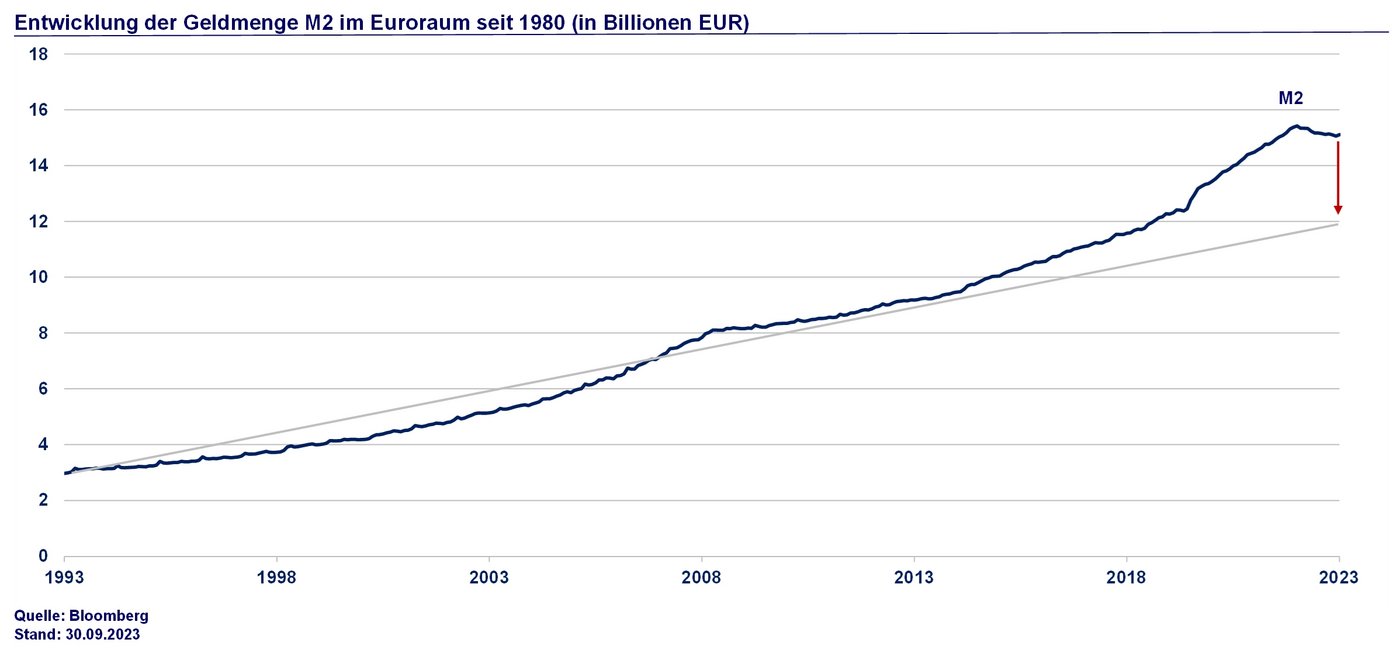 Obgleich die Veränderungsraten der Geldmengen in den USA und Europa aktuell deutlich negativ geworden sind, die Liquidität (besonders real betrachtet) also schrumpft, ist der zuvor aufgebaute Geldüberhang in absoluter Betrachtung vermutlich noch immer stimulierend für die Kapitalmärkte.