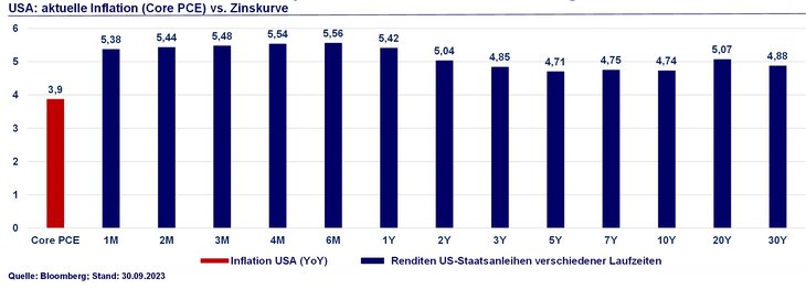 Die Notenbanken betonen in ihrer Kommunikation weiterhin Entschlossenheit, die Inflationsraten auf 2% zurückführen zu wollen. Das ist nach dem Inflationsschock 2021/22 verständlich, keineswegs aber selbstverständlich, waren doch vor nicht allzu langer Zeit noch abenteuerliche Ideen einer "Durchschnittsinflation" nicht nur salonfähig, sondern fast schon Konsens unter Zentralbankräten. Die weitreichenden Folgekosten der Hochinflation haben offenkundig ein Umdenken bewirkt. Dem US-Notenbankchef Jay Powell gebührt zudem Respekt, ist es ihm doch auf der jährlichen Sommerklausurtagung in Jackson Hole dem Vernehmen nach gelungen, Begehrlichkeiten nach einer Höhersetzung des Inflationsziels auf 3% abzuwenden. Solange Konjunktur und Arbeitsmärkte robust bleiben, wird die Fed im restriktiven Modus verbleiben, möglicherweise gar über ein oder zwei weitere Zinsanhebungen nachdenken. Gemäß Jay Powells Vorgabe bei der Jackson Hole Tagung im Jahr 2022 könnte die Notenbank aber auch aktuell schon "mission accomplished" feststellen, liegt doch die Renditekurve der US-Staatsanleihen nunmehr vollständig oberhalb der Kerninflationsrate. Das Eintreten dieser Relation war vom Notenbankchef letztes Jahr als Vorbedingung definiert worden, um der Teuerung nicht länger mit Zinserhöhungen entgegenwirken zu müssen.