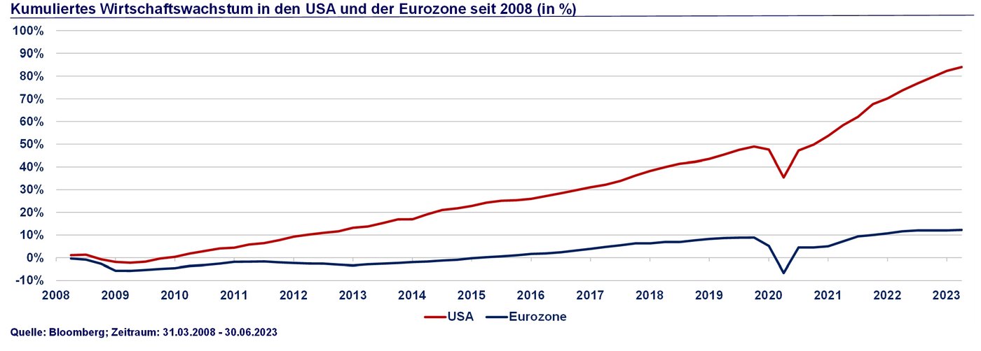Auch im Vergleich zu den USA verlieren die deutsche und europäische Wirtschaft kontinuierlich an Boden. War die Wirtschaftsleistung zum Zeitpunkt der Finanzkrise 2008 noch etwa vergleichbar, ist seitdem eine klare Auseinanderentwicklung zu verzeichnen. Deutliches Wachstum in den USA steht im Kontrast zu einer weitgehenden Stagnation in Europa, sodass die Wertschöpfung in den Vereinigten Staaten heute fast doppelt so hoch ist wie in Europa.
