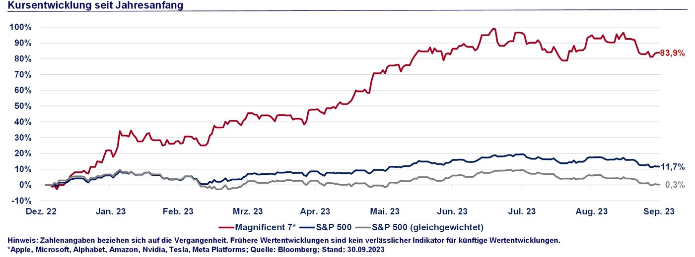 Über weite Strecken des 3. Quartals 2023 setzte sich am Aktienmarkt die bemerkenswerte Outperformance der "Magnificent Seven" (Apple, Microsoft, Alphabet, Amazon, Nvidia, Meta Platforms, Tesla), die wir bereits im letzten Quartalsbericht ausführlich diskutiert hatten ("What were you thinking?"), fort. Unverändert erachten wir die starke Einseitigkeit der Märkte mit ihrer engen Stilpräferenz für Mega-Cap Wachstumswerte im Technologiebereich als Warnsignal.