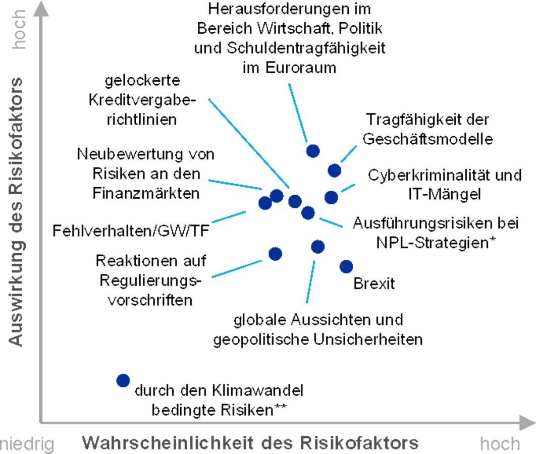 Anmerkungen: *Die mit den Strategien der Banken für notleidende Kredite (Non-Performing Loans – NPLs) verbundenen Ausführungsrisiken betreffen nur Banken mit hohen NPL-Beständen. **Die durch den Klimawandel bedingten Risiken sind eher auf längere Sicht (d. h. über einen Zeithorizont von mehr als drei Jahren) relevant.