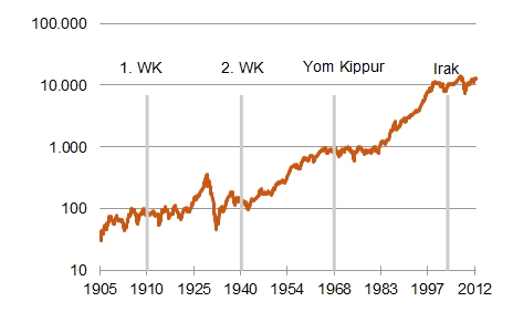 Abbildung: Wie reagieren Aktien auf Kriege? Dow Jones, log. Maßstab [Quelle: Fred Data]
