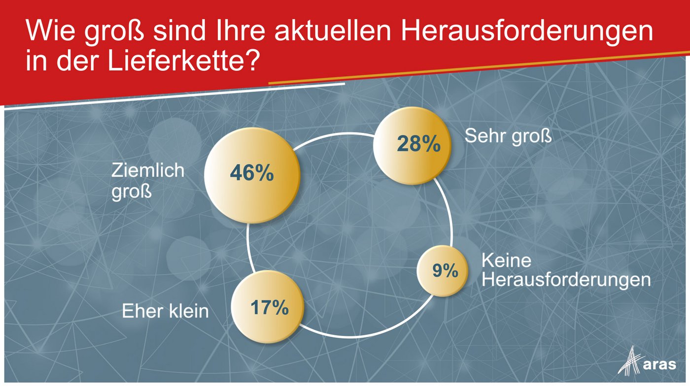 Schon ab dem Jahr 2023 sollen Unternehmen mit mehr als 3.000 Mitarbeitern sicherstellen, dass ihre Lieferanten die Menschenrechte beachten, sich an die Arbeitssicherheit halten und Auflagen des Umweltschutzes erfüllen. Ein Jahr später folgen dann auch Unternehmen ab 1.000 Mitarbeitern. Aber sind die Unternehmen auch bereit für diesen Schritt? Eine im Auftrag von Aras durchgeführte Befragung unter deutschen Unternehmen zeigt, dass die Betriebe schon jetzt reichlich mit ihren Lieferketten zu kämpfen haben. Drei von vier Unternehmen sehen in der Supply Chain die zentrale Herausforderung für das laufende Jahr, erst danach folgen die Megathemen Digitalisierung und Nachhaltigkeit. Für die Aras-Studie "Von Nachhaltigkeit bis Digitalisierung: Challenges 2022" wurden mehr als 130 Top-Führungskräfte deutscher Unternehmen mit einem Umsatz von mindestens 100 Mio. Euro befragt.