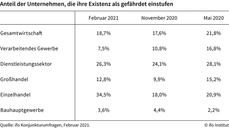 In der Folge der politischen Maßnahmen zur Bekämpfung der Corona-Pandemie sieht sich fast jedes fünfte Unternehmen in Deutschland in der Existenz bedroht. Das geht aus der neuesten Konjunkturumfrage des ifo Instituts hervor. Demnach waren es im Februar 18,7 Prozent, nach 17,6 Prozent im November 2020 und 21,8 Prozent im Mai 2020. "Besonders gefährdet unter den großen Wirtschaftszweigen fühlte sich im Februar der Einzelhandel mit 34,5 Prozent der Firmen, vor den Dienstleistern mit 26,3 Prozent", sagt der Leiter der ifo-Umfragen, Klaus Wohlrabe. Unterdurchschnittlich bedroht sehen sich der Großhandel mit 12,8 Prozent der Unternehmen, die Industrie mit 7,5 Prozent und der Bau mit 3,6 Prozent. "Insbesondere Unternehmen mit Liquiditätsproblemen fürchten um ihre Zukunft", ergänzt er.