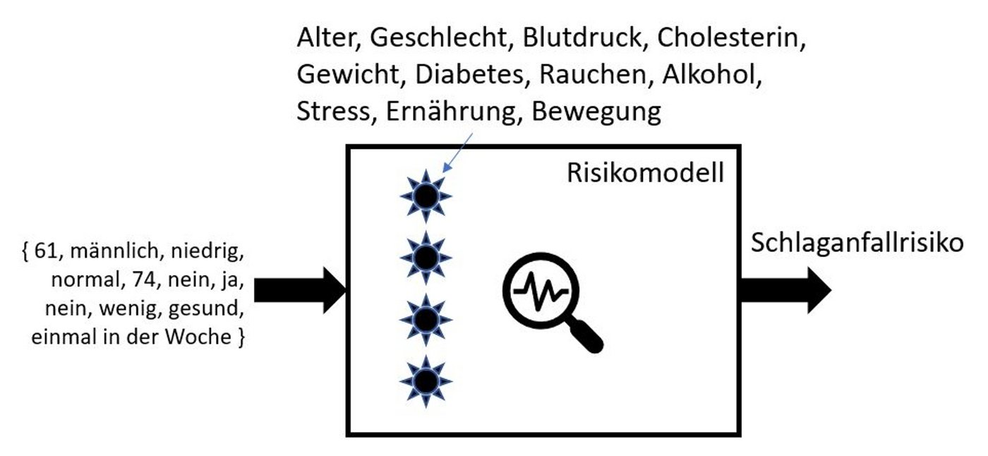 Um ein Risikomodell an einem greifbaren Beispiel zu erklären, nachfolgend das von einem medizinischen Laien (mir) entworfene Modell zur Bestimmung des Schlaganfallrisikos: